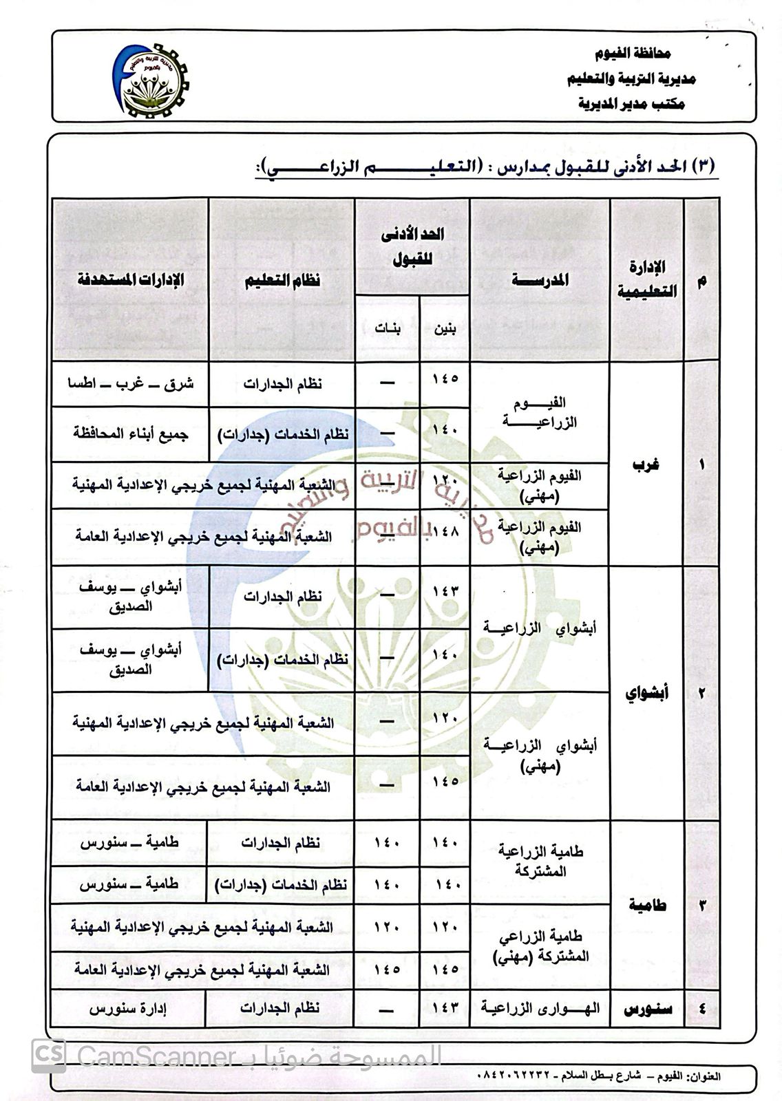 وجاءت درجات تنسيق القبول بالمدارس الفنية الزراعية، كما يلي، مجموع 145 درجة لمدرسة الفيوم الزراعية بنين، نظام الجدارات، ومستهدف بها طلاب إدارات شرق وغرب الفيوم وإطسا التعليمية، ومجموع 140 درجة للمدرسة نفسها “نظام الخدمات”، ومستهدف بها جميع أبناء المحافظة، ومدرسة الفيوم الزراعية “مهني بنين” 120 درجة لطلاب الشعبة المهنية لجميع خريجي الإعدادية المهنية، ومجموع 148 درجة لمدرسة الفيوم الزراعية “مهني بنين” لطلاب الشعبة المهنية لجميع خريجي الإعدادية العامة، ومجموع 143 درجة لمدرسة أبشواى الزراعية بنين “نظام الجدارات”، و140 درجة للمدرسة نفسها لنظام “الخدمات” ويستهدف بها طلاب إدارتي أبشواي ويوسف الصديق للنظامين، ومدرسة أشواى الزراعية “مهني بنين” بمجموع 120 درجة، للشعبة المهنية لجميع خريجي الإعدادية المهنية، ومجموع 145 درجة لجميع جريجي الإعدادية العامة، ومدرسة طامية الزراعية المشتركة، بمجموع 140 درجة للنظامين “جدارات وخدمات”،ويستهدف بها طلاب إدارتي طامية وسنورس التعليميتين، ومدرسة طامية الزراعية المشتركة “مهني”، بمجموع 120 درجة لجميع طلاب الشعبة المهنية بالإعدادية المهنية، ومجموع 145 درجة للمدرسة نفسها، لجميع طلاب الشعبة المهنية بالإعدادية العامة، ومدرسة الهواري الزراعية بسنورس “بنين” بمجموع 143 درجة لنظام الجدارات.