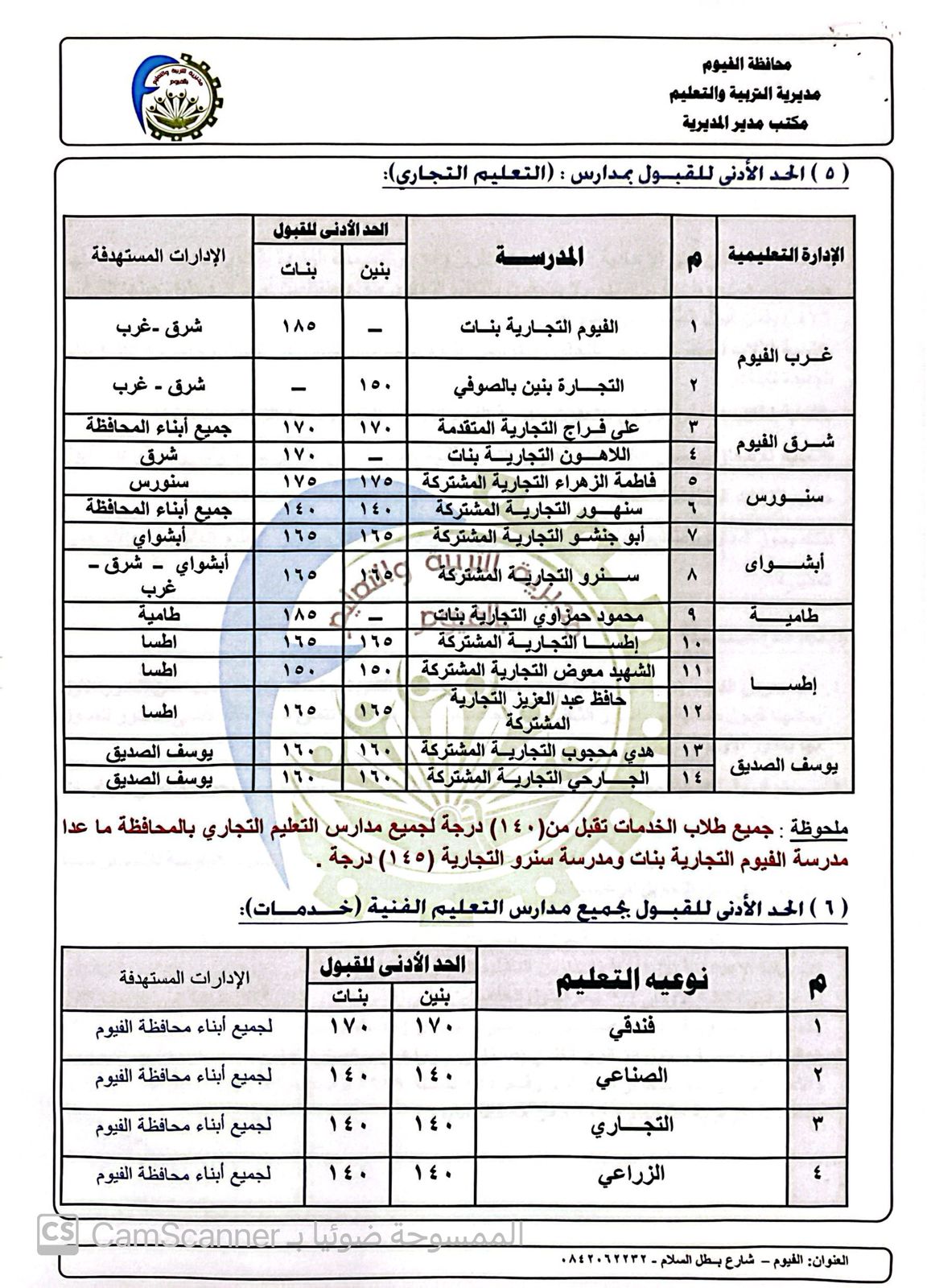 وفيما يتعلق بالحد الأدني للقبول بجميع مدارس التعليم الفنية “خدمات” جاءت كالتالي: مدارس التعليم الثانوي الفندقي بمجموع 170 درجة، ومدارس الثانوي الصناعي والزراعي والتجاري بمجموع 140 درجة لكل منهم، علماً بأن جميع الطلاب الراغبين في الالتحاق بمدارس التعليم الصناعي “خدمات” بمجموع 140 درجة لجميع المدارس، عدا مدرسة الفنية الصناعية بنات بالحادقة، ومدرسة الفنية الصناعية بنات الجديدة بمجموع 145 درجة، ومدرسة زكي صالح الفنية الصناعية بنات بمجموع 141 درجة، والطلاب الراغبين في الالتحاق بمدارس التعليم التجاري “خدمات” بالمحافظة، بمجموع 140 درجة لجميع المدارس، عدا مدرستي الفيوم التجارية بنات، ومدرسة سنرو التجارية بمجموع 145 درجة.