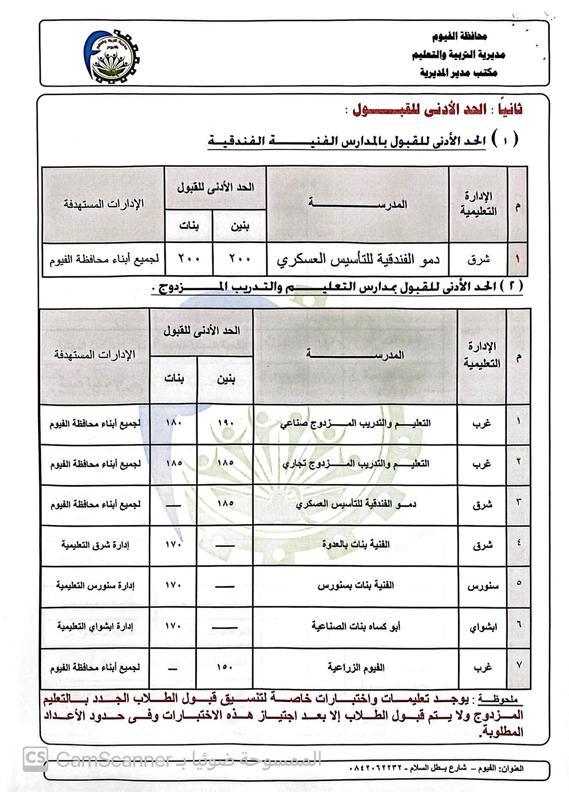 فيما جاء تنسيق مدارس التعليم الثانوي الفني ” صناعي، زراعي، تجاري، فندقي، مزدوج”، حيث تم تحديد الحد الأدنى للقبول بمدرسة دمو الفندقية للتأسيس العسكري “بنين وبنات” بمجموع 200 درجة، والحد الأدنى للقبول بمدارس التعليم والتدريب المزدوج كالتالي، مدرسة التدريب والتعليم المزدوج صناعي، بإدارة غرب الفيوم التعليمية، بمجموع 190 درجة للبنين، ومجموع 180 درجة للبنات، ومدرسة التعليم والتدريب المزدوج تجاري “بنين وبنات”، بإدارة غرب الفيوم التعليمية بمجموع 185 درجة، ومدرسة دمو الفندقية للتأسيس العسكري “بنين”، بإدارة شرق الفيوم التعليمية، بمجموع 185 درجة، والمدرسة الفنية بنات بالعدوة، التابعة لإدارة شرق الفيوم التعليمية، بمجموع 170 درجة، والمدرسة الفنية بنات بسنورس بمجموع 170 درجة، ومدرسة أبوكساه الصناعية للبنات بأبشواي، بمجموع 170 درجة، ومدرسة الفيوم الزراعية “بنين” بإدارة غرب الفيوم التعليمية، بمجموع 150 درجة، وتوجد تعليمات واختبارات خاصة لتنسيق قبول الطلاب الجدد بالتعليم المزدوج، ولا يتم قبول الطلاب إلا بعد اجتياز هذه الاختبارات وفي حدود الأعداد المطلوبة.