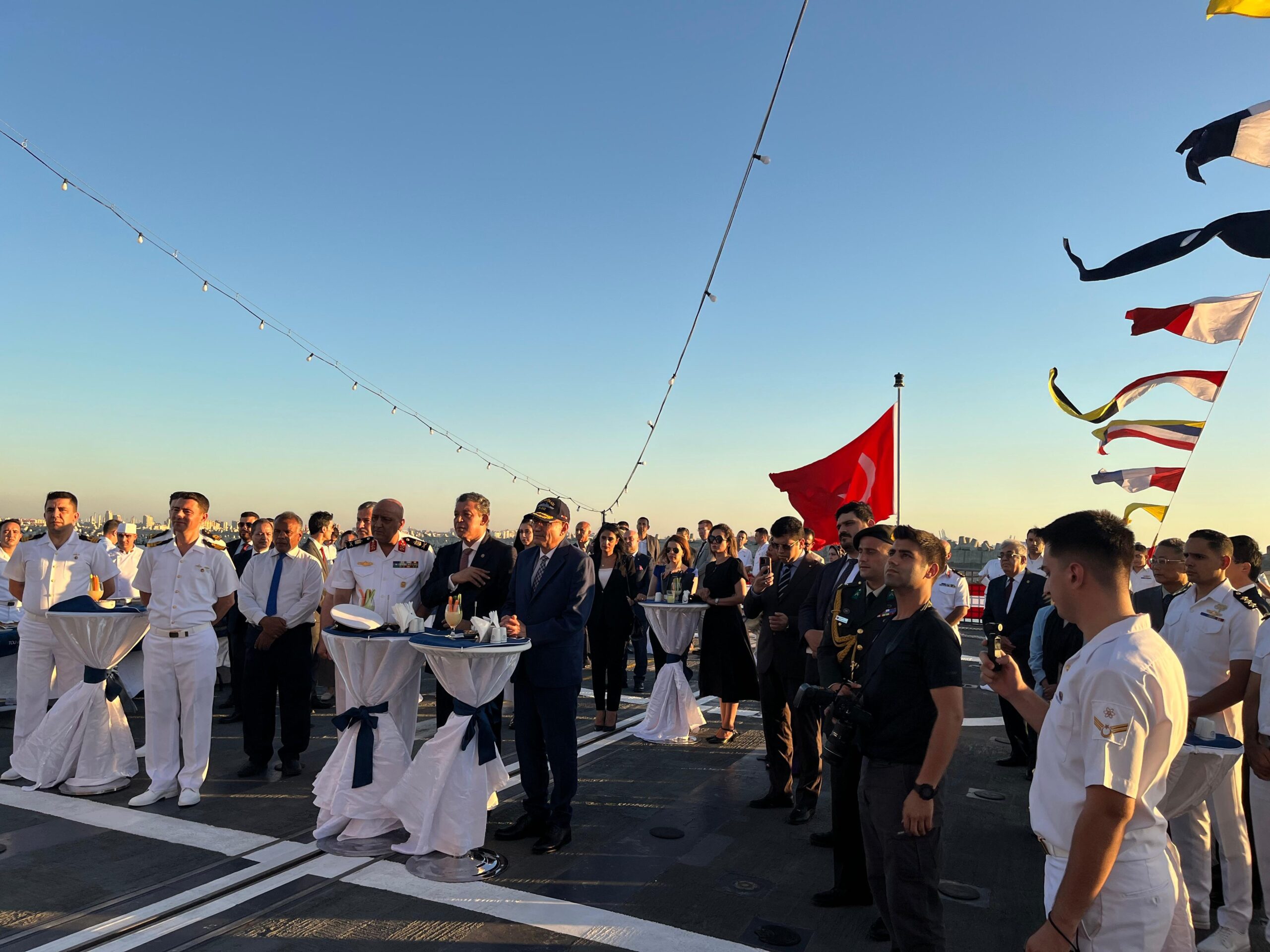 وفي المساء نفسه، أقيم حفل استقبال على متن السفينة من قبل السفير التركي بالقاهرة، صالح موطلو شن، وقائد السفينة، المقدم بحري أنيل بيلجين.