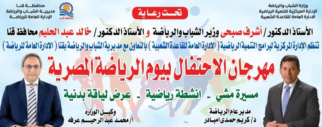 نظمت مديرية الشباب والرياضة بقنا صباح اليوم، فعاليات يوم رياضي مفتوح ، تخلله أنشطة رياضية ، مسيرة مشى ، عرض لياقة بدنية بمركز شباب مدينة قنا تحت شعار “مصر الرياضية”، الذى أطلقته وزارة الشباب والرياضة بمشاركة محافظات الجمهورية احتفالًا بأول إنجاز رياضي مصري تحقق في دورة الألعاب الأوليمبية أمستردام ١٩٢٨، تأكيدًا على أهمية الرياضة كأداة تنموية ومجتمعية ورسالة لدعم الأبطال الأوليمبيين.