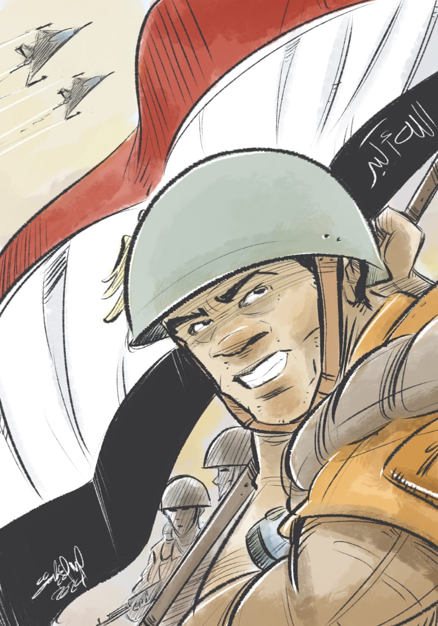 يضم المعرض 36 عملًا كاريكاتيريًا بمشاركة 25 فنانًا من مصر والسعودية، بالإضافة إلى عرض مجموعة من أعمال رواد فن الكاريكاتير الذين شاركوا في رصد لحظات النصر، وعلى رأسهم صلاح جاهين، مصطفى حسين، جورج بهجوري، أحمد طوغان، جمعة فرحات، عبد العزيز تاج، أحمد علوي، سعيد بدوي، ونخبة من فناني الكاريكاتير أعضاء الجمعية المصرية للكاريكاتير.